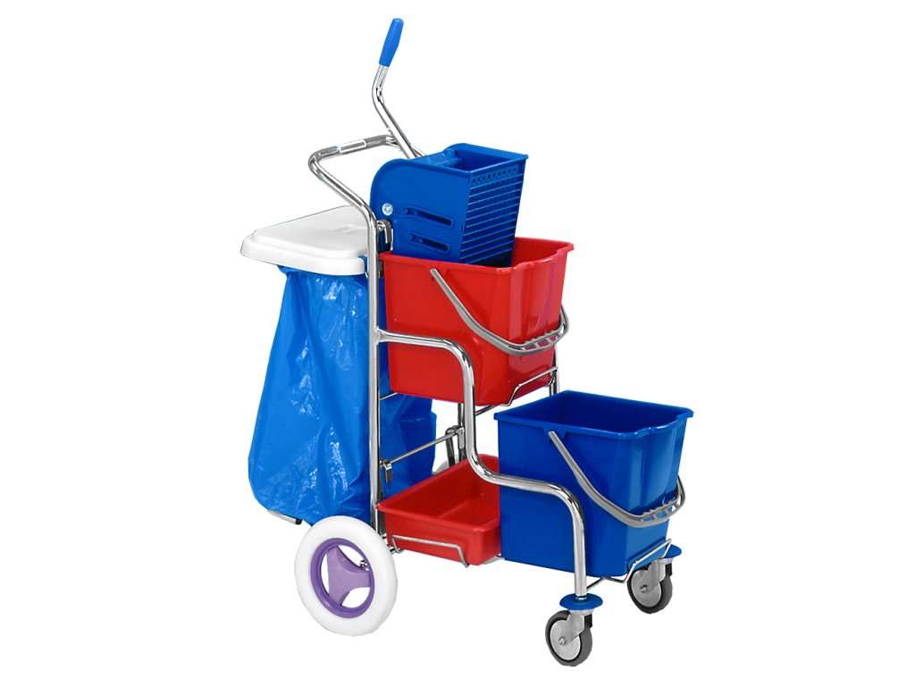 Kamzík s košíky je vozík vhodný pro úklid na více podlažích, protože díky kolečkům pr. 220 mm lze sjíždět s vozíkem i po schodech.