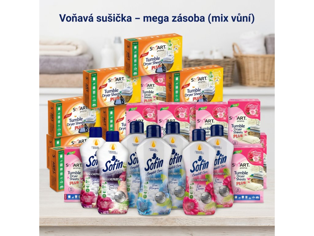 - Mix vůní pro střídání podle nálady a typu prádla – květinové varianty Sofin + 2 varianty ubrousků.