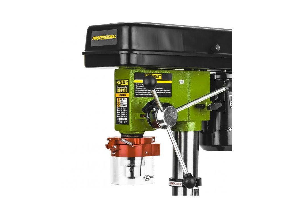 Sloupová vrtačka Procraft BD1950 je určena k vrtání do dřeva, kovu nebo plastů. Regulace otáček v 16 rychlostních stupních vrtání umožňuje nastavení optimálních parametrů při práci s různými materiály. Silný motor s výkonem 450 W a vysokých otáček až 3140 zaručuje dlouhou bezporuchovou práci. Ozubené sklíčidlo umožňuje upnutí vrtáků a stopkových nástrojů do průměru 16 mm. Možnost natáčení pracovního stolu až o 360° a naklápění do úhlu ±45°. Balení karton.