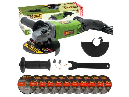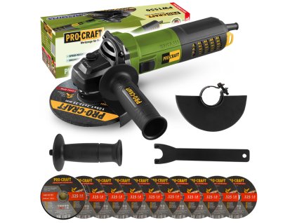 Bruska úhlová Procraft PW1200 Součástí balení: uhlíkové kartáče, montážní klíč Příkon: 860W Průměr kotouče: 125mm Otáčky: 0-11000/min Vřeteno: M14 Hmotnost: 2kg