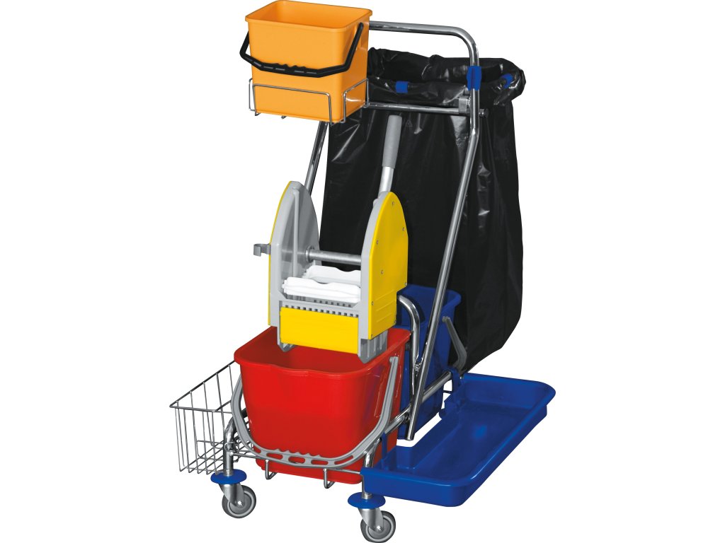 V ceně vozíku: podvozek s vodítkem, rošt pod pytel, držák pytle, 3x svorka pytle, 2x kbelík 17 l, ždímač, koš otočný pravý, kbelík 6 l, podpěra plastová, držák tyče alu, košík boční Maxi
