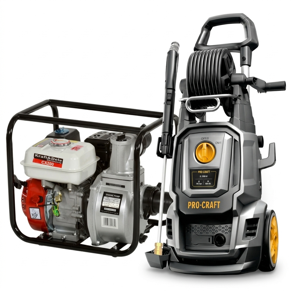 Zatímco benzínové vodní čerpadlo 3" 4,8 kW 1000 l/min slouží k rychlému čerpání a přečerpávání vody, vysokotlaký čistič PROCRAFT CW2.5-195 195 bar je určený k účinnému odstraňování nečistot pomocí tlakového vodního paprsku. V praxi to znamená, že jeden set pokrývá dvě důležité oblasti – hospodaření s vodou a údržbu.