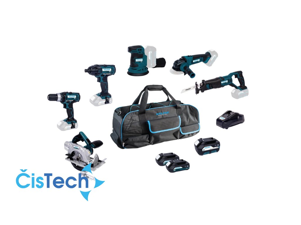 Sada nářadí XTLINE obsahuje aku vrtačku, aku rázový utahovák na bity, aku úhlovou brusku 115 mm, aku vibrační brusku, aku kotoučovou pilu, 2x baterii 18 V 2.0 Ah, 1x baterii 18 V 4.0 Ah a nabíječku baterií. Všechna zařízení jsou vybavena protiskluzovým měkkým držadlem pro ergonomickou a bezpečnou manipulaci. Systém akumulátoru XTLINE poskytne dostatek energie pro celou řadu akumulátorového nářadí XTLINE. Jednou baterií totiž můžete pohánět všechny produkty setu.Doplňkové parametry