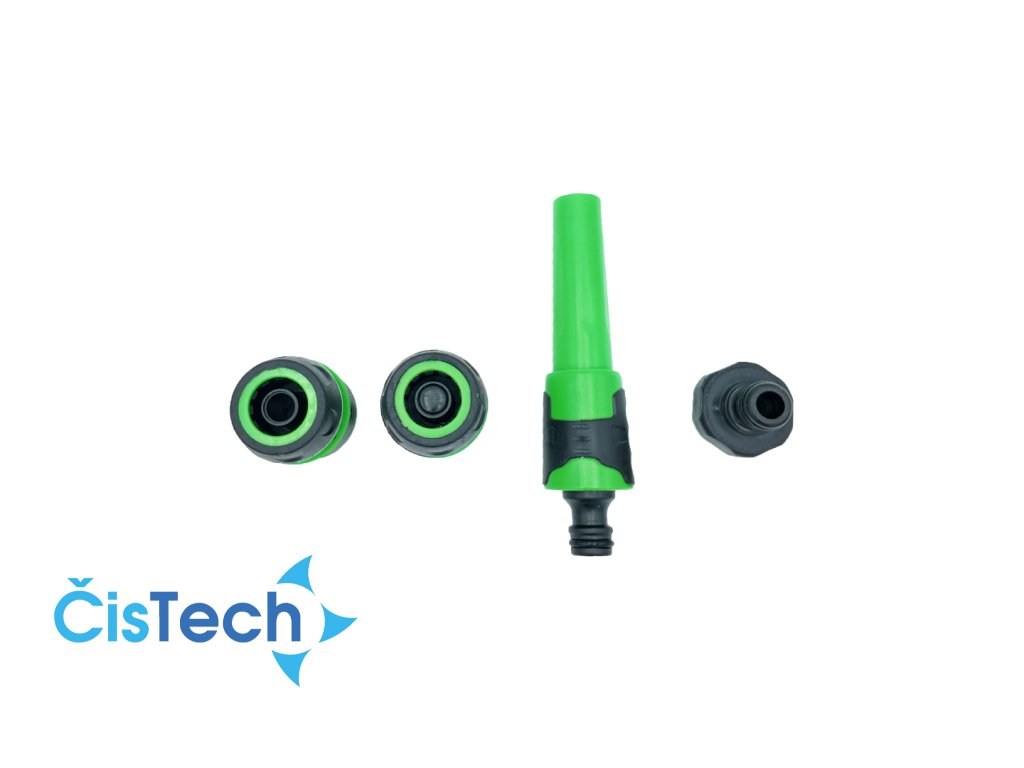 Příslušenství: Sada obsahuje dvě rychlospojky, přípojku, trysku a držak na hadice.